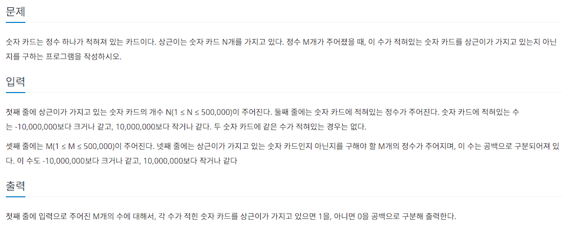 가지고 있는 카드 배열 card를 해시 테이블 unordered_set으로 재정의해주고, search 에 대해 반복문을 통해 현재 탐색하는 값 x를 가지고 있는지 확인한다.