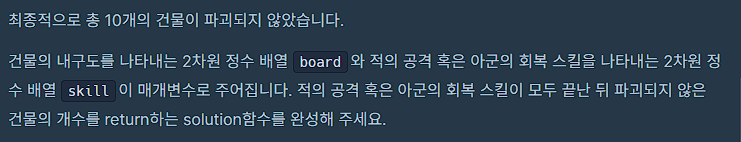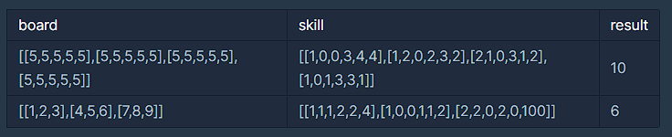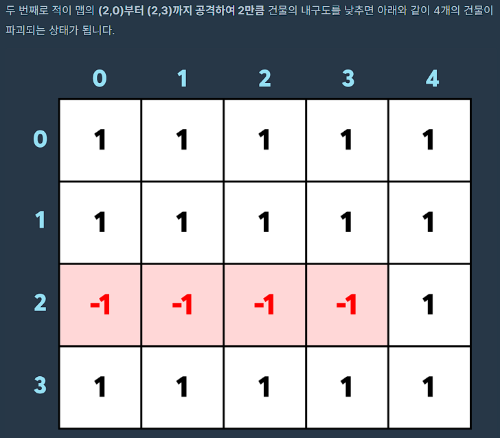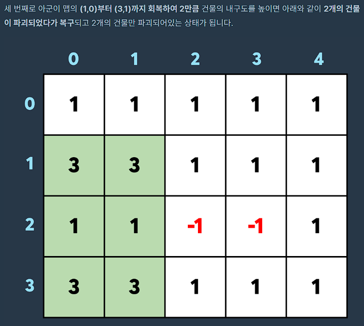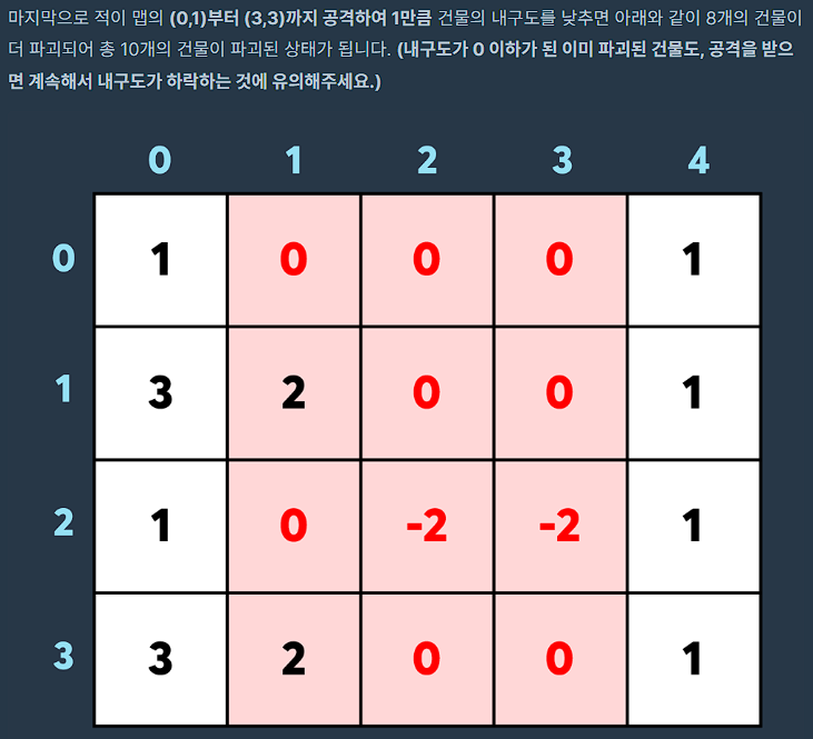 다만 우리는 이대로 정답을 도출하는 것이 아니라, 기존 board 배열에 저장된 건물 기초 내구도를 더해주어야 한다.