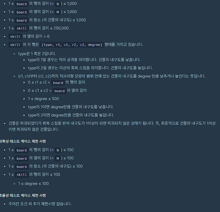 프로그래머스의 파괴되지 않은 건물(Lv3) 문제이다. [ 문제풀이 ] 정확성과 효율성이 있는 문제이다. 문제가 되게 간단해 보이고 간단해 보이는 만큼 간단하게 접근해서 풀게되면 정확성 면에서