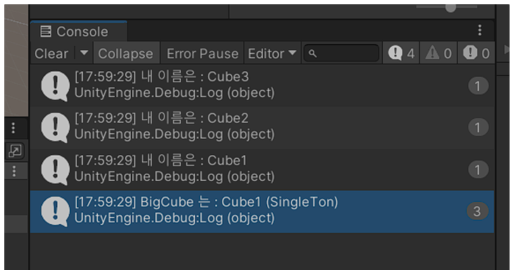 이 때 Cube1이 싱글톤이 적용된 객체가 될 것이다.