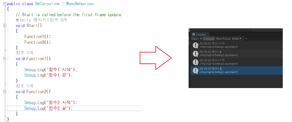 Debug.Log("함수2 시작");