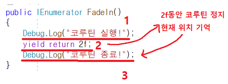 2. yield return 을 만난 위치를 기억하여, 대기 시간이 종료된 후 해당 위치에서 코드가 이어서 진행된다.