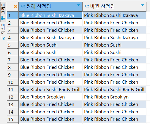 replace(restaurant_name, 'Blue', 'Pink') "바뀐 상점명"