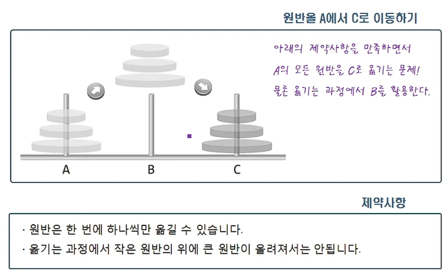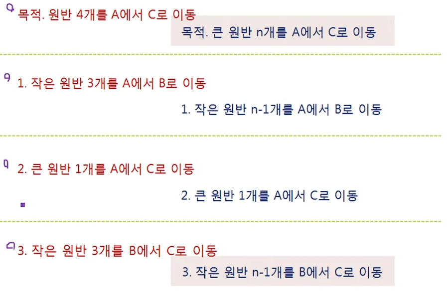 다시 반복해서, 3의 원반을 옮기기 위해서는 2, 1의 2개의 원반을 옮겨야 하고
