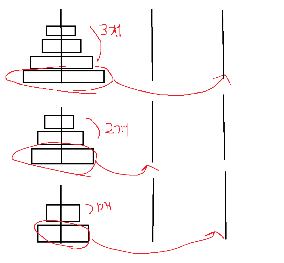 그러기 위해서는 위의 3, 2, 1 총 3개의 원반을 옮겨야 한다.