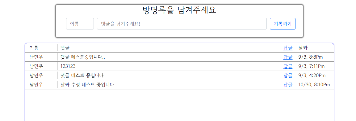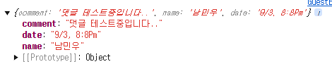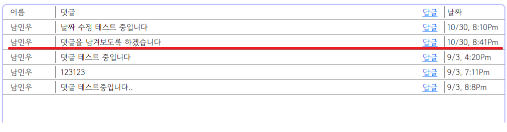 댓글을 남긴 시간과 이름, 내용이 같이 저장된 모습을 볼 수 있다.