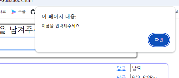 추가적으로, 기록하기 중 이름/내용을 작성하지 않았을 경우 alert() 를 통해 빈 항목을 알려주기로 하였다.