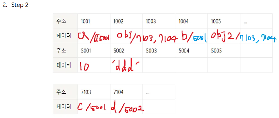이렇게 a와 b가 들어가는 별도의 메모리 영역이 생성되고, 이 a와 b에 1과 'bbb'의 데이터 주소가 들어간다.