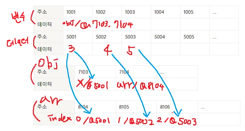 쉽게 말해서 객체 obj 를 위한 별도 공간 하나, 객체 안의 객체인 arr 을 위한 별도 공간이 하나 더 생성되는 방식이다.