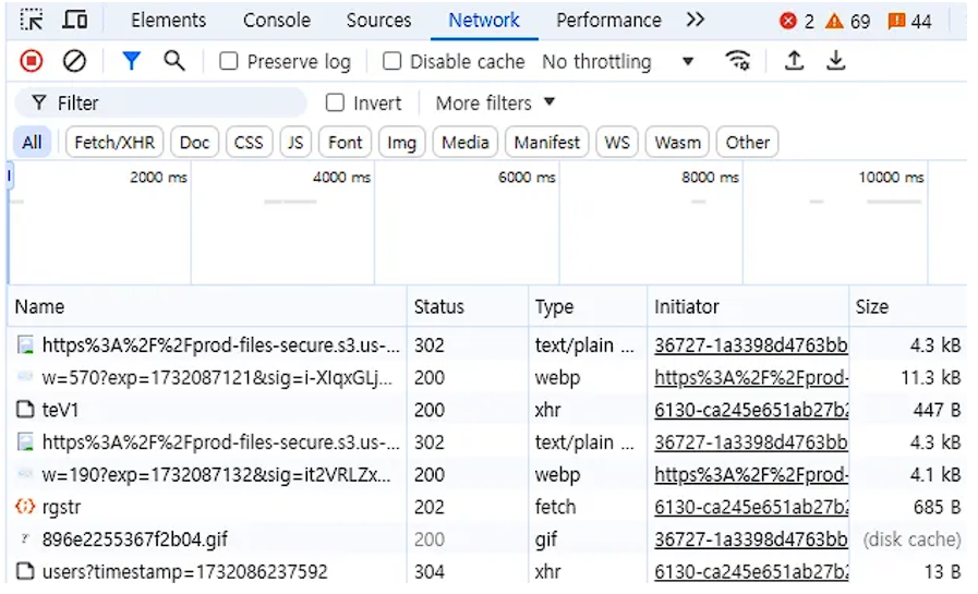 브라우저의 F12 - Network 항목에서 볼 수 있는 화면이다.