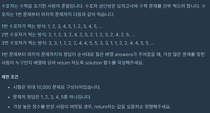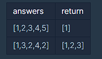 단순히 한명만 구하는 문제가 아니라는 말이기에 애초에 주어진 answer 도 배열의 형태로 주어졌고, 모두가 동일한 횟수의 답을 맞춘 경우, 예시 2번의 경우도 생각을 해야 한다.