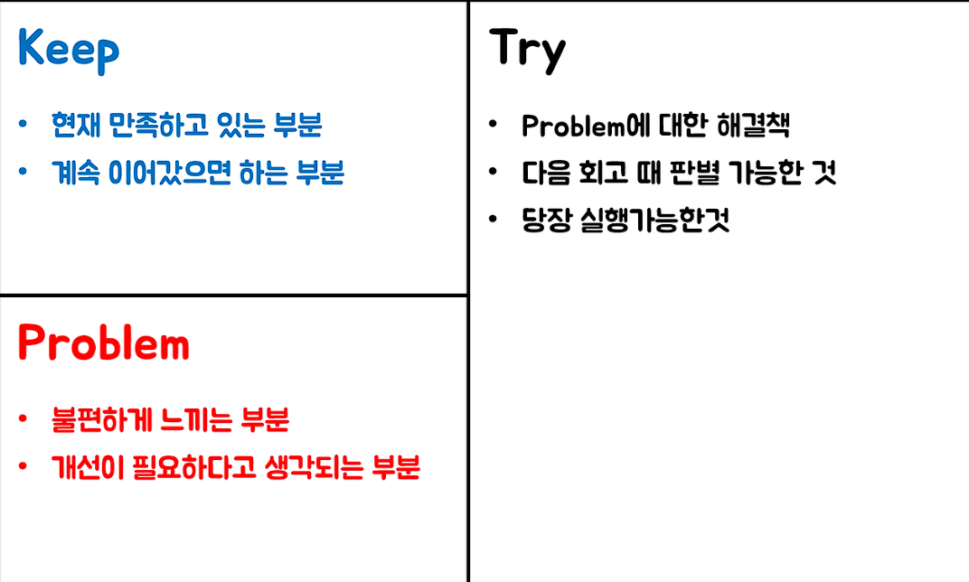 K : Keep - 현재 만족하고 있는 점, 앞으로도 유지할 만한 점에 대해 논의