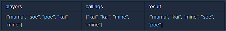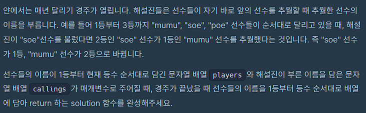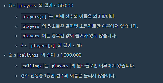 첫 for문을 통해 선수의 이름과 해당 인덱스를 할당해주었고 이를 callings 를 반복하는 for문에서 사용해주었다.
