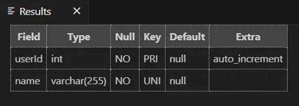 이렇게 2개의 필드(컬럼) 이 적용되어 있고 각각의 타입과 NULL 허용하는지, Key 속성 등이 나타난다.