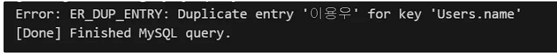 Users 테이블의 name 컬럼에 '이용우' 라는 값이 중복되었다 라고 알려주고 있다.