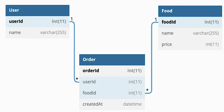 [음식 1개는 주문 N개에 포함이 가능하다] 는 점은 음식 테이블과 주문 테이블이 1 : N 의 관계임을 나타낸다.