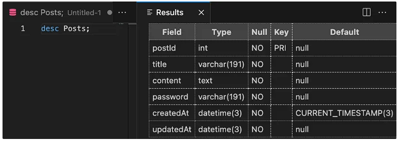 title, content, password 총 3개의 컬럼에 대한 값만 입력해주었지만, postId, createdAt, updatedAt 의 컬럼은 자동적으로 데이터가 입력되는 모습 또한 확인할 수 있다.