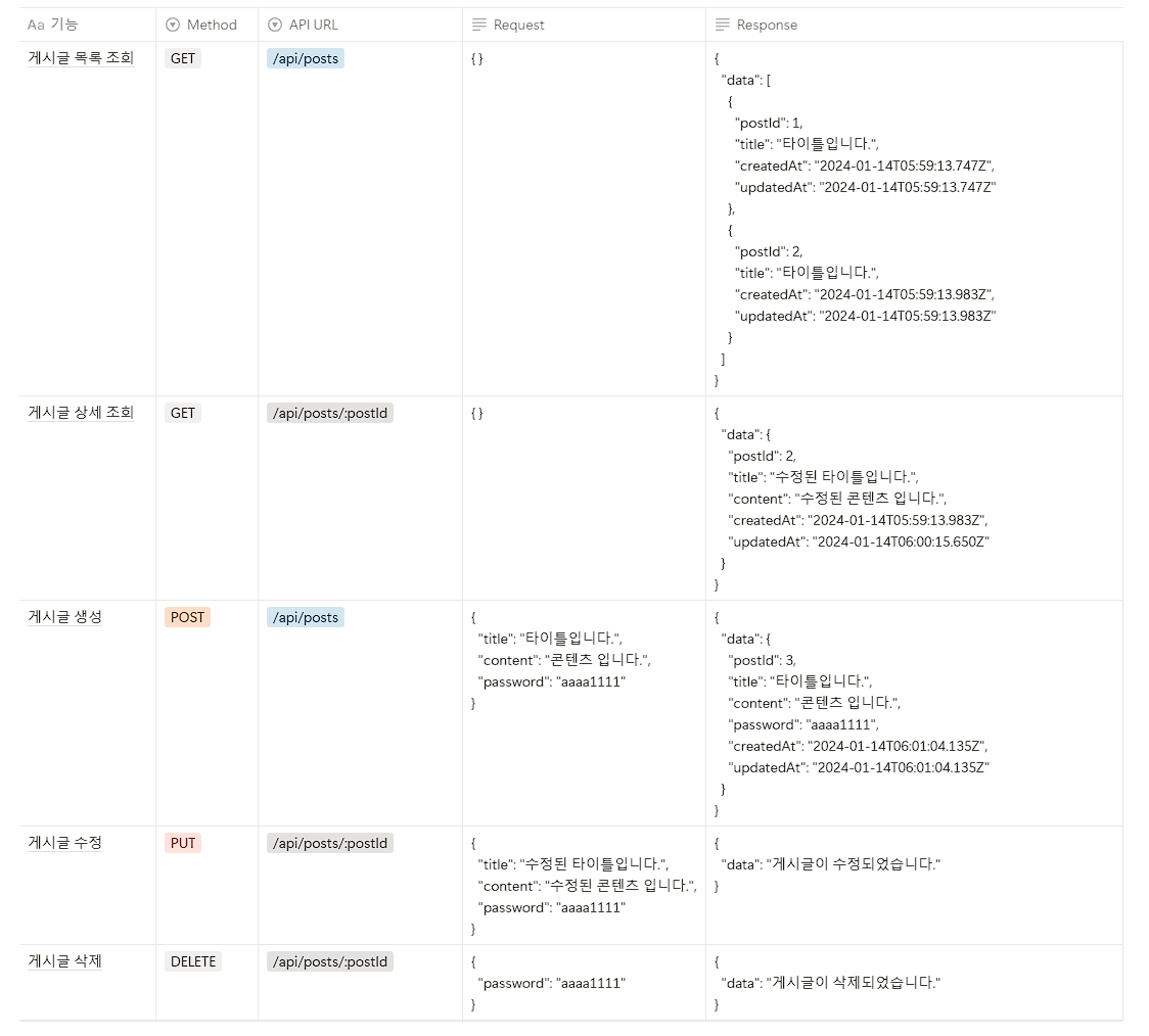 이 테이블을 통해 진행할 실습은 게시글 관련 API들을 만들고 이에 필요한 인자값 3개를 이용해 권한 검증 및 데이터 생성 과정을 구현할 것이다.