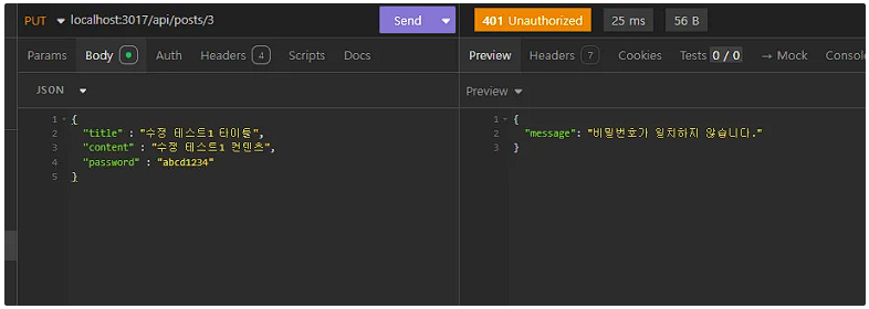 postId = 3인 경우는 존재하지만 비밀번호가 틀린 경우도 완벽하게 잡아낼 수 있다.