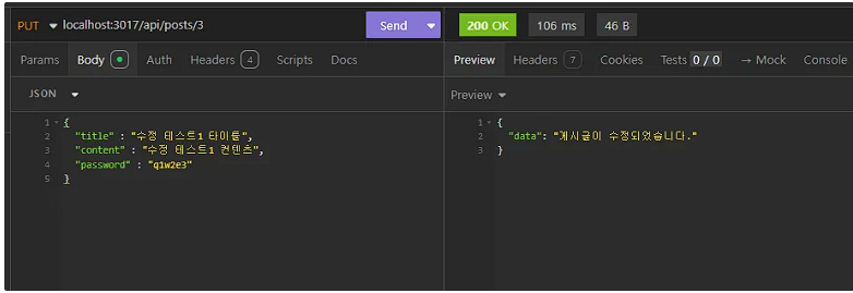 2. 변경할 title, content 와 권한 인증을 위한 password 를 body로 전달