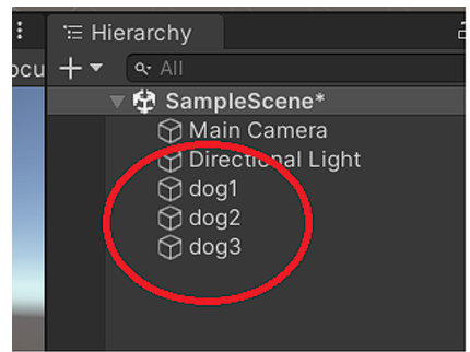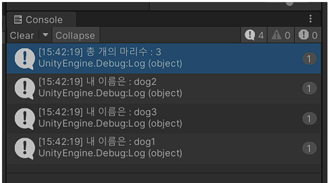 //Dog 스크립트에서 개의 총 마리수를 알려주는 Debug.Log 는 삭제