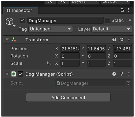 DogManager 라는 객체를 만들어서 스크립트를 할당해주었다