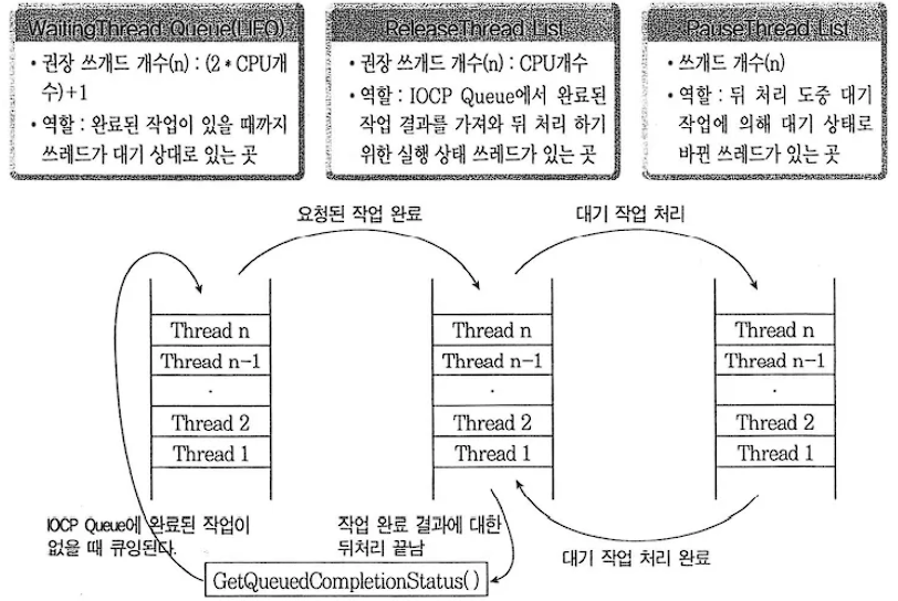 커널은 '스레드 풀링 매커니즘'을 이용해 IOCP Queue 에서 완료된 Overlapped I/O 작업을 가져와 후처리를 진행한다.