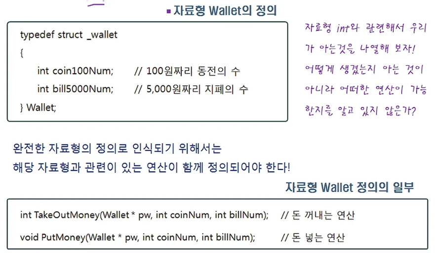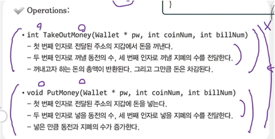 이 구조체의 변수들(wallet 의 경우에는 coin100Num, bill5000Num)을 사용하고자 하는 모든 연산들은 이 함수로 사용하는 것이 원칙이다.