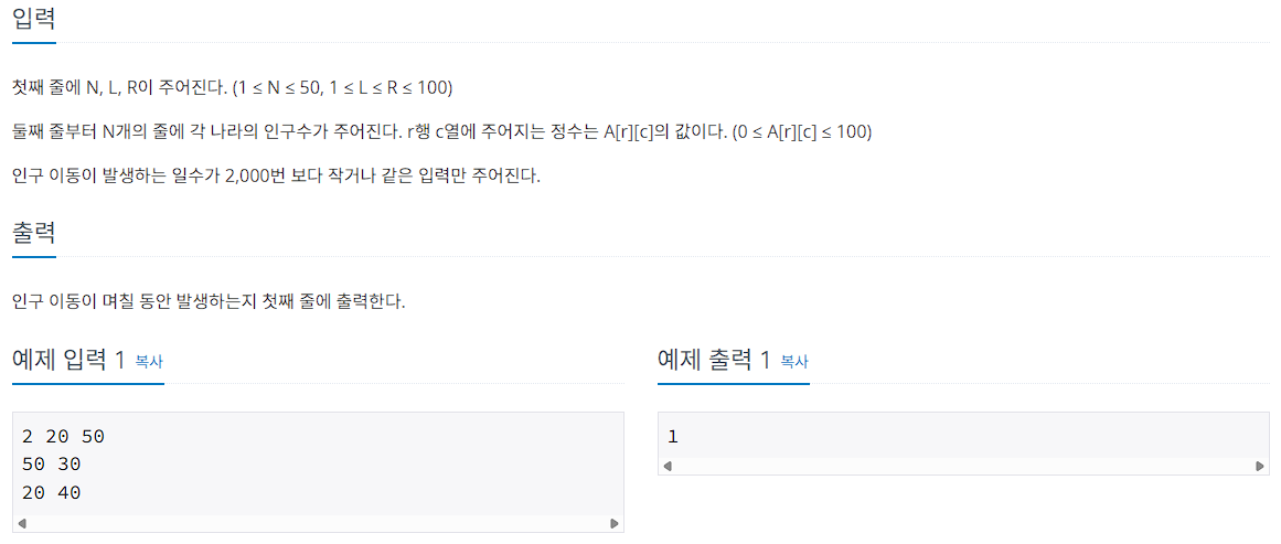 Main 문에서는 입력값 N, L, R, country[][]를 입력받고, BFS에 진입하기 위한 조건을 마련한다.